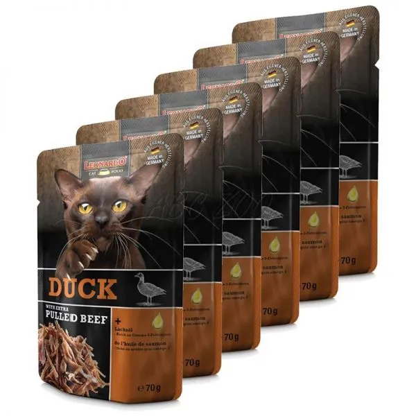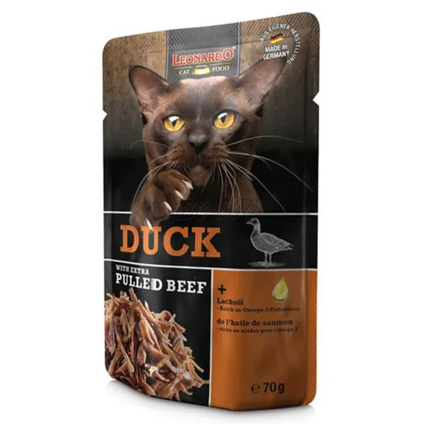Leonardo je šťavnatá kapsička z kačacieho mäsa s pridaným trhaným hovädzím mäsom, pre dospelé mačky.