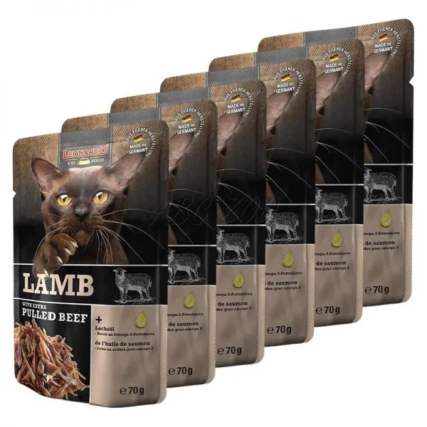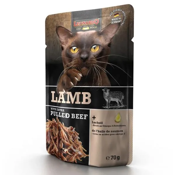 Leonardo je šťavnatá kapsička z jahňacieho mäsa s pridaným trhaným hovädzím mäsom, pre dospelé mačky.