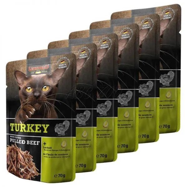 Leonardo je šťavnatá kapsička z morčacieho mäsa s pridaným trhaným hovädzím mäsom, pre dospelé mačky.