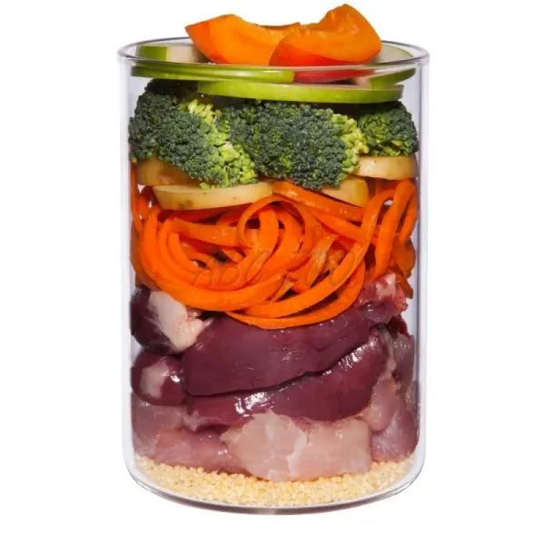 Zloženie: Morčacie mäso 46 % (morčacie srdce 22 %, morčací žalúdok 12 %, morčacia pečeň 6 %, morčacia svalovina 3 %, morčacia koža 3 %), vývar 17 %, mrkva 12 %, zemiaky 9 %, hruška 5 %, proso 5 %, marhuľa 2 %, brokolica 1 %, minerály 1 %*, repkový olej, ľanové semienko, bazalka*, petržlenová vňať*, ustricová lastúra*, minerálny íl*, pivovarské kvasnice*, spirulina*