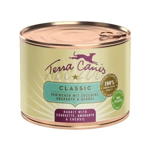 Konzervy Terra Canis z línie CLASSIC obsahujú vysoký podiel mäsa a čerstvej zeleniny, ovocia a byliniek. Na živiny bohaté, ľahké, bezlepkové pseudozrná (napr. proso, amarant, ryža natural) sú pridávané vo veľmi malých množstvách, ktoré sú pre psa ľahko stráviteľné (4 – 10 %). Prírodné prísady (morské riasy, minerálny íl, peľ kvetov, šípky, andská soľ, pivovarské kvasnice) dodávajú dôležité vitamíny, minerály a stopové prvky. Repkový olej poskytuje cenné esenciálne mastné kyseliny. Všetky zložky sú 100% ľudskej kvality.