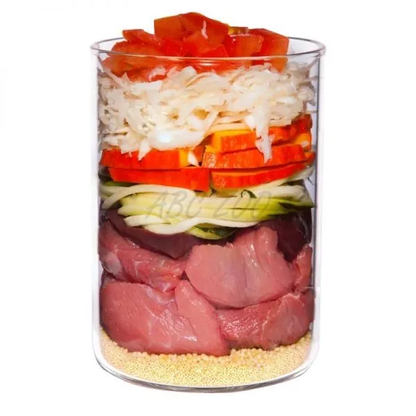 Pomer Mäso : zelenina/ovocie/bylinky : amarant + proso : ostatné suroviny = 65 % : 24 % : 3 % + 6 % : 2 %