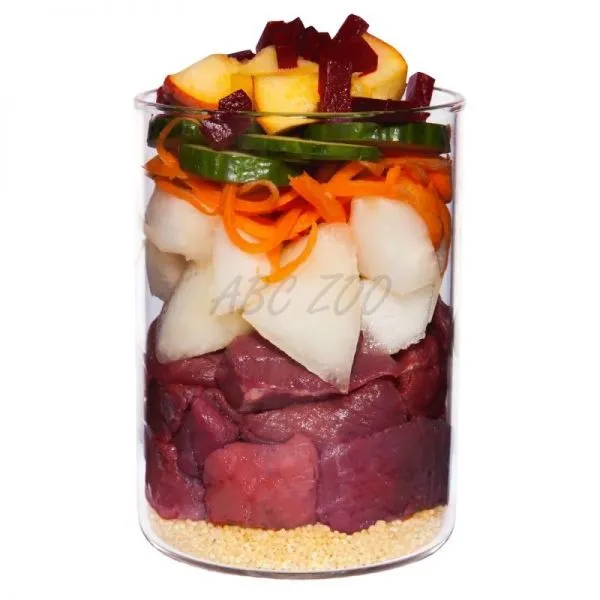 Zloženie: Teľacie mäso 44 % (teľacie srdce 32 %, teľacie pľúca 12 %), vývar 19 %, mrkva 7 %, proso 6 %, zeler 5 %, melón 5 %, uhorka 4 %, cvikla 3 %, marhuľa 2 %, minerály 1 %*, repkový olej, trebuľka*, feniklové semienka*, bazalka*, tymian*, šípková kôra*, andská soľ, ustricová lastúra*, minerálny íl*, pivovarské kvasnice*, spirulina*