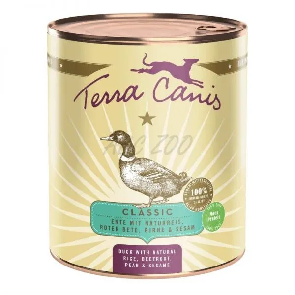 Konzervy Terra Canis z línie CLASSIC obsahujú vysoký podiel mäsa a čerstvej zeleniny, ovocia a byliniek. Na živiny bohaté, ľahké, bezlepkové pseudozrná (napr. proso, amarant, ryža natural) sú pridávané vo veľmi malých množstvách, ktoré sú pre psa ľahko stráviteľné (4 – 10 %). Prírodné prísady (morské riasy, minerálny íl, peľ kvetov, šípky, andská soľ, pivovarské kvasnice) dodávajú dôležité vitamíny, minerály a stopové prvky. Repkový olej poskytuje cenné esenciálne mastné kyseliny. Všetky zložky sú 100% ľudskej kvality.