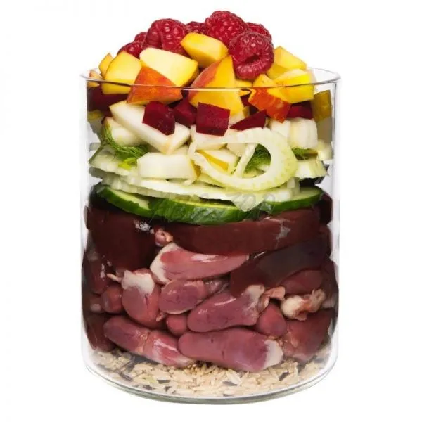 Zloženie: Kačacie srdce (42 %), kačacia pečeň (11 %), hruška (7 %), broskyňa, fenikel, uhorka, ryža natural (7 %), červená repa* (7 %), maliny (1,5 %), repkový olej, ustrice*, mletý sezam* (0,4 %), pivovarské kvasnice*, rasca*, minerálna rasca*, muškátová soľ*, marjoram* morské riasy*, minerálne