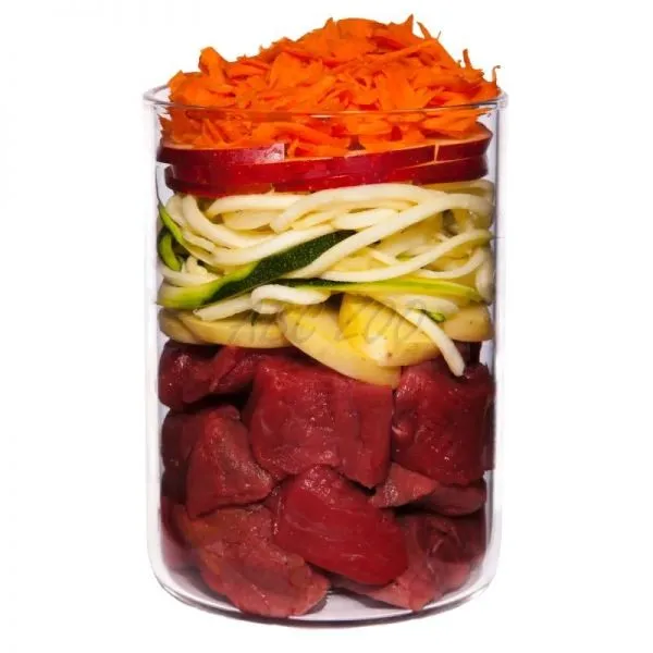Pomer Mäso : zelenina/ovocie/bylinky : ostatné suroviny = 55% : 42% : 3%