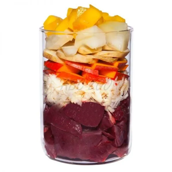 Zloženie: Teľacie mäso 46 % (teľacie srdce 35 %, teľacie pľúca 11 %), vývar 24 %, tekvica 8 %, petržlenová vňať 8 %, melón 5 %, mango 3 %, kokosová múka 1 %, minerály 1 %*, paštrnák, čierna ríbezľa 0,5 %, repkový olej, tekvicová múka, pivovarské kvasnice*, šalvia*, bazalka*, ustricová lastúra*, andská soľ, kerblík*, feniklové semienka*, púpava*, minerálny íl*, spirulina*