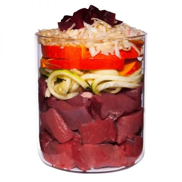 Zloženie: Hovädzie mäso 47 % (hovädzie srdce 34 %, hovädzie pľúca 9 %, hovädzia svalovina 4 %), vývar 25 %, tekvica 12 %, cuketa 7 %, cvikla 3 %*, paštrnák 1 %*, minerály 1 %*, kokosová múka, repkový olej, tekvicová múka, pivovarské kvasnice*, psyllium*, bazalka*, andská soľ, ustricová lastúra*, oregano 0,1 %*, petržlenová vňať*, minerálny íl*, spirulina*