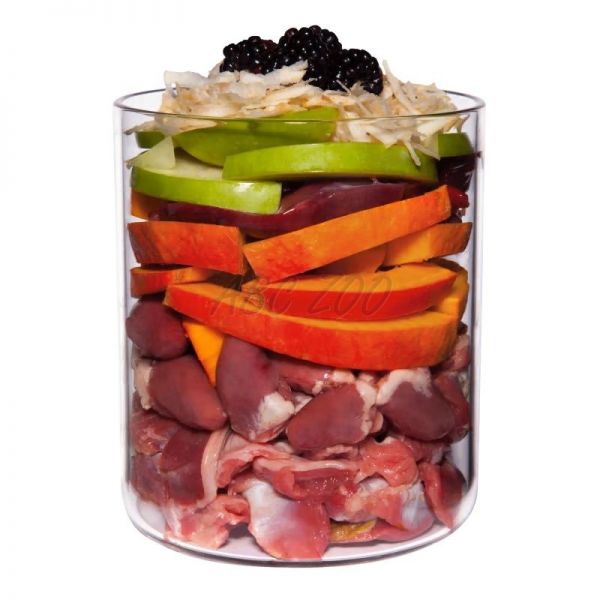 Zloženie: Kuracie mäso 49 % (kuracie žalúdky 26 %, kuracie srdce 15 %, kuracia svalovina 4 %, kuracia koža 2 %, kuracia pečeň 2 %), vývar 23 %, tekvica 12 %, jablko 6 %, černice 2 %, minerály 1 %*, kokosová múka, paštrnák 0,8 %*, repkový olej, tekvicová múka, pivovarské kvasnice*, psyllium*, harmanček*, šípkové šupky*, ustricová škrupina*, púpava 0,1 %*, andská soľ, minerálny íl*, spirulina*