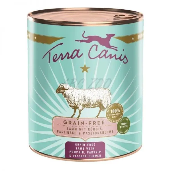 Terra Canis Grain-Free je kompletné krmivo s jahňacím mäsom, tekvicou, paštrnákom a mučenkou pre dospelých psov všetkých plemien.