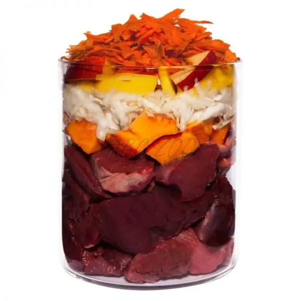 Zloženie: Jahňacie mäso 42 % (jahňacie srdce 33 %, jahňacie pľúca 9 %), vývar 25 %, mrkva 9 %, tekvica 9 %, jablko 6 %, broskyňa 3 %, paštrnák 1 %*, minerály 1 %*, repkový olej, lupinová múčka*, kokosová múka, pivovarské kvasnice*, mučenka 0,2 %*, bazalka*, púpava*, šalvia*, minerálny íl*, ustricová lastúra*, andská soľ, spirulina*