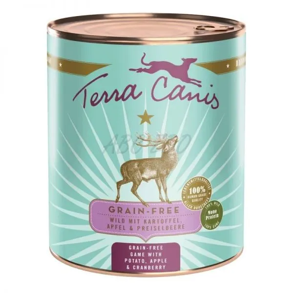 Konzervy Terra Canis z línie Grain-Free obsahujú vysoký podiel mäsa a čerstvej zeleniny, ovocia a byliniek. Prírodné prísady (morské riasy, minerálny íl, peľ kvetov, šípky, andská soľ, pivovarské kvasnice) dodávajú dôležité vitamíny, minerály a stopové prvky. Repkový olej poskytuje cenné esenciálne mastné kyseliny. Všetky zložky sú 100% ľudskej kvality. Toto bezobilné krmivo je vhodné najmä pre psov s intoleranciou na obilniny, ako aj pre psov, ktorí potrebujú zo zdravotných dôvodov kŕmivo bez obilnín.