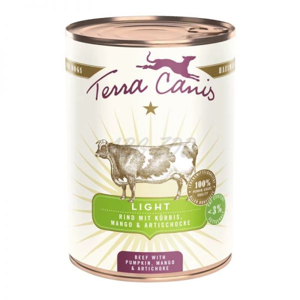 Konzervy Terra Canis z línie Light obsahujú približne 3 % tuku a sú nízkokalorické – ideálne pre psov s nadváhou, ktorým sa odporúča nízkokalorická a nízkotučná strava. Obsahujú len chudé mäso a ovocie a zeleninu s nízkym obsahom škrobu. Kokosová múka, olej z hroznových jadierok a artičokové listy podporujú metabolizmus tukov a je tiež známe, že majú pozitívny vplyv na hladinu lipidov v krvi. Vláknina zo šupiek psyllia podporujú pocit sýtosti.
