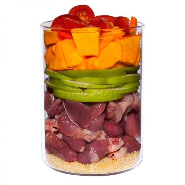 Zloženie: Kuracie srdce (33 %), kurací žalúdok (14 %), tekvica (14 %), proso, jablko, paradajka, kuracia svalovina (6 %), kuracia pečeň (4 %), repkový olej, múka z tekvicových semien (1 %), ustrice*, pivovarské kvasnice*, harmanček* (0,2 %), kremelina*, šípkový prášok*, minerálny íl*, morské riasy*, minerály