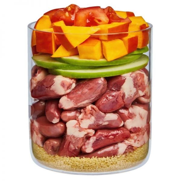 Zloženie: Kuracie srdce (33 %), kurací žalúdok (14 %), tekvica (14 %), proso, jablko, paradajka, kuracia svalovina (6 %), kuracia pečeň (4 %), repkový olej, múka z tekvicových semien (1 %), ustrice*, pivovarské kvasnice*, harmanček* (0,2 %), kremelina*, šípkový prášok*, minerálny íl*, morské riasy*, minerály