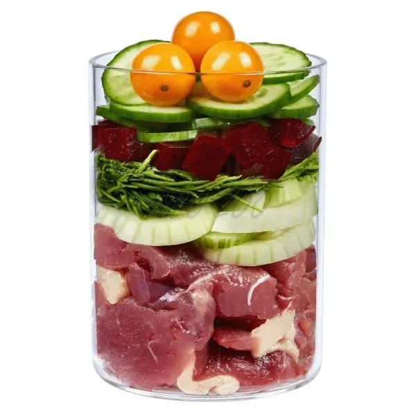 Zloženie: Kačacie mäso 46 % (kačacie srdce 43 %, kačacia pečeň 3 %), vývar 14 %, mrkva 12 %, zemiaky 11 %, jablko 4 %, uhorka 4 %, cvikla 3 %*, melón 2 %, jahody 1 %, minerály 1 %*, kokosová múka*, repkový olej, šupka zo šípok 0,1 %*, feniklové semeno*, šalvia*, andská soľ*, koral sangový 0,1 %*, minerálny íl*, ustricová lastúra 0,1 %*, spirulina*