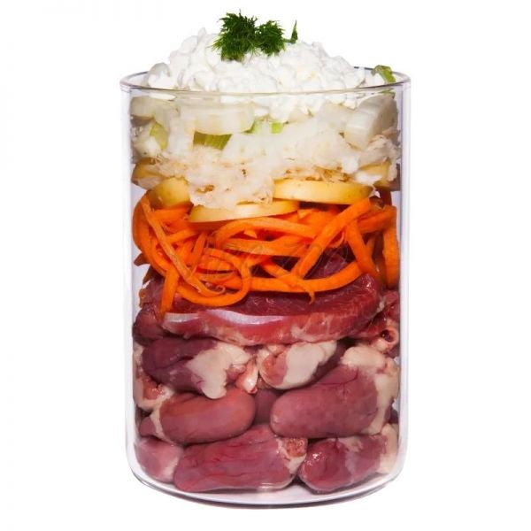 Zloženie: Kuracie mäso 45 % (kuracie srdce 30 %, kurací žalúdok 15 %), vývar 22 %, mrkva 13 %, zemiaky 10 %, zeler 3 %, tvaroh 2 %, fenikel, kokosová múka*, ustricová lastúra*, harmanček 0,4 %*, minerálny íl*, nechtík lekársky 0,2 %*, čierna rasca 0,1 %*, andská soľ*, spirulina*