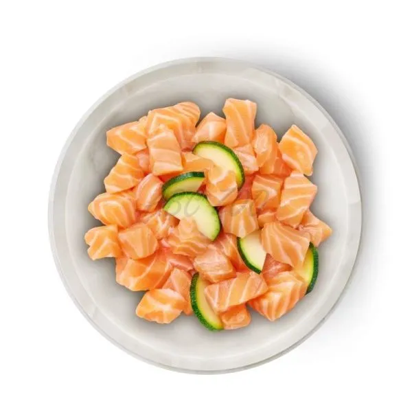 Zloženie: Losos 54 %, vývar 38 %, cuketa 3 %, glycín 2 %, ustricové lastúry 1 %*, paradajkový prášok*, špenát*, taurín, pivovarské kvasnice*, minerály*