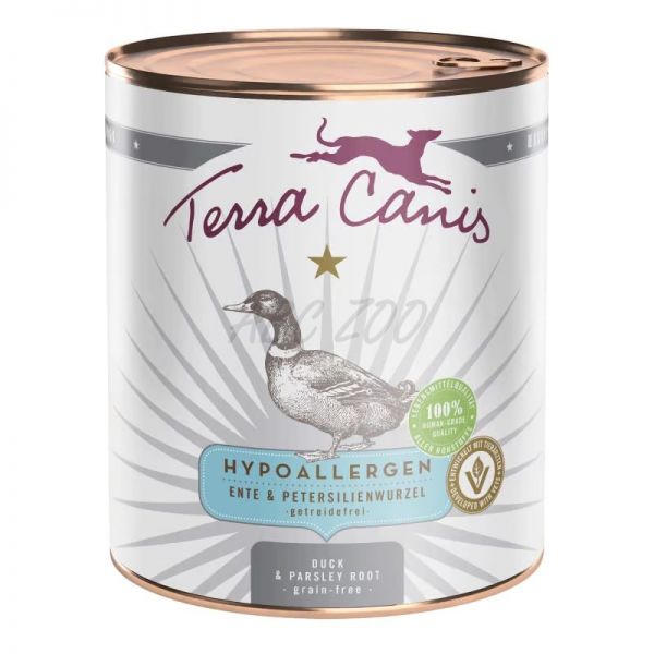 Konzervy Terra Canis z línie HYPOALLERGENIC obsahujú mäso z čistej svaloviny (60 %) z jediného exotického zdroja bielkovín doplnené o nízkoalergénnu zeleninu.  Všetky zložky sú 100% ľudskej kvality. Vhodné pre psov s potravinovými alergiami / intoleranciami a na vykonávanie vylučovacej diéty.
