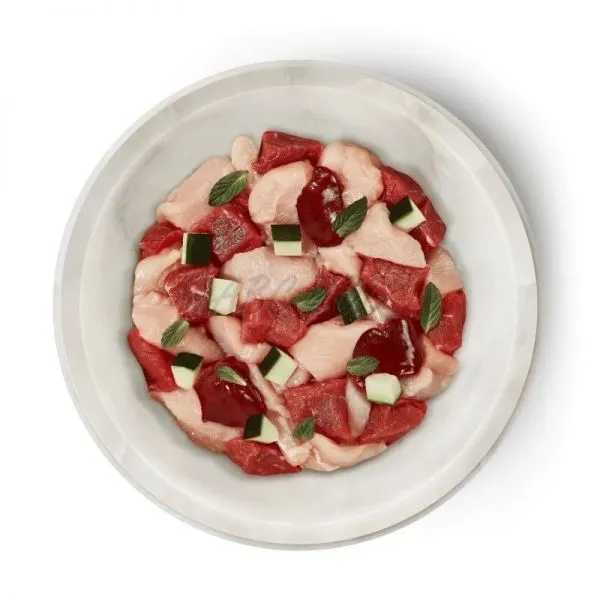 Zloženie: Jahňacie mäso zo srdcového svalu (43 %), kurací žalúdok (16 %), kuracia svalovina (11 %), kuracia pečeň (10 %), kuracia koža (10 %), cuketa (4 %), paradajkový prášok, repkový olej, kocúrnik*, minerálne látky