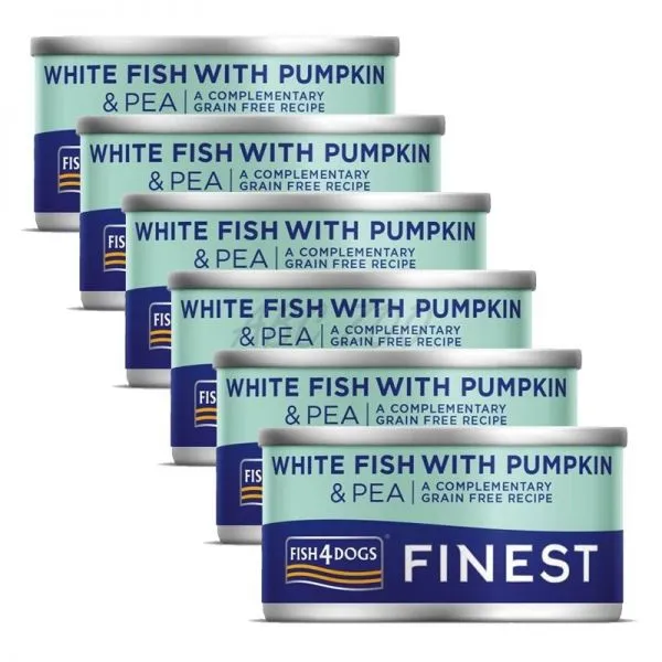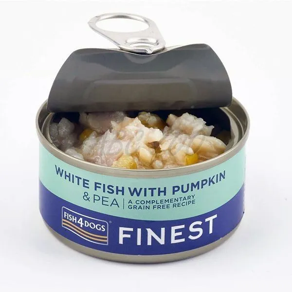 Fish4Dogs Finest White Fish with Pumpkin je konzerva pre psov s bielou rybou, tekvicou a hráškom vyrobená z kvalitných rýb a zeleniny.