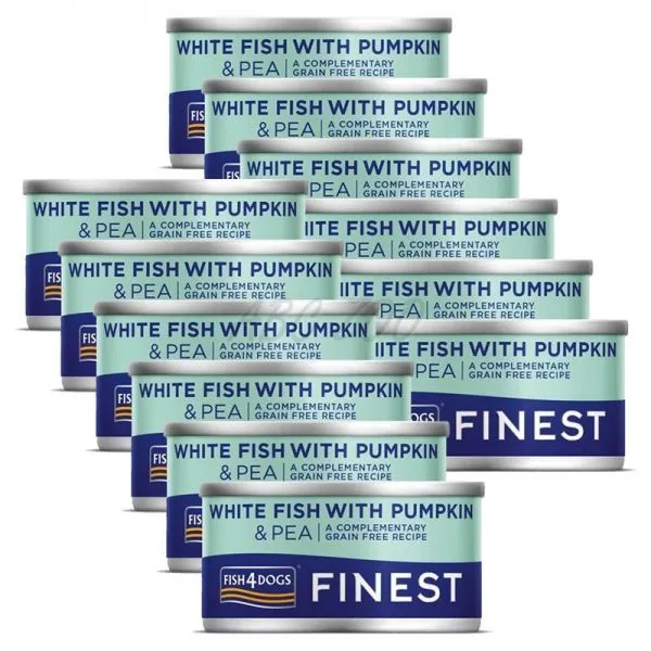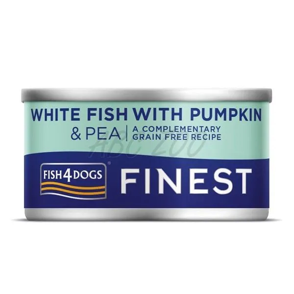 Fish4Dogs Finest White Fish with Pumpkin je konzerva pre psov s bielou rybou, tekvicou a hráškom vyrobená z kvalitných rýb a zeleniny.