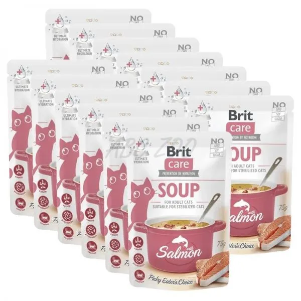 Brit Care Cat Soup with Salmon je polievka pre dospelé aj kastrované mačky všetkých plemien, bez umelých aróm a konzervantov.