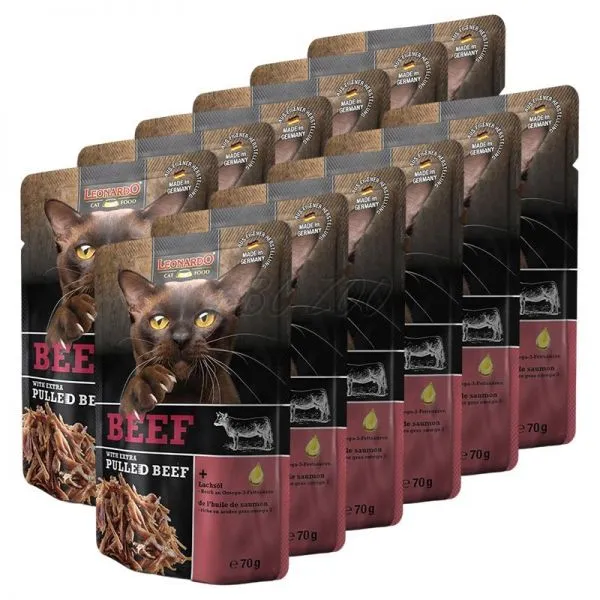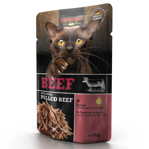 Leonardo je šťavnatá kapsička z hovädzieho mäsa s pridaným trhaným hovädzím, pre dospelé mačky.