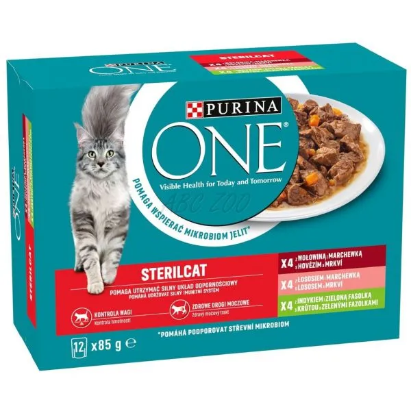 PURINA ONE STERILCAT kapsičky - multibalenie s hovädzím, lososom a mrkvou, s morkou a zelenými fazuľkami v lahodnej šťave.