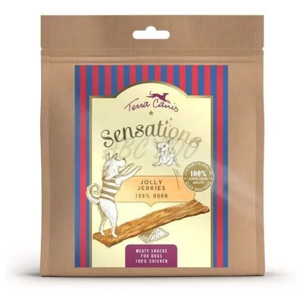 Terra Canis Jolly Jerkies je chrumkavá 100% mäsová pochúťka pre psov, ideálna ako odmena.