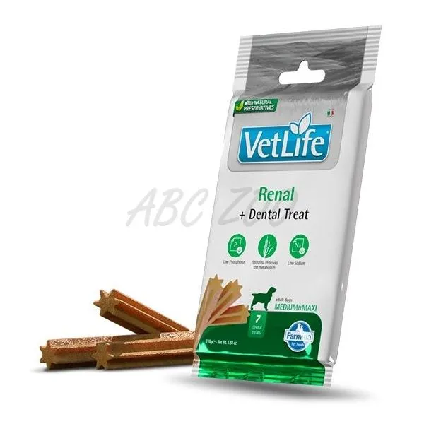 Farmina Vet Life Renal sú dentálne pamlsky určené dospelým psom stredných a veľkých plemien na podporu funkcie obličiek.