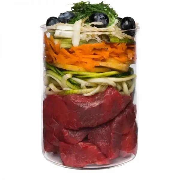 Zloženie: konské svalové mäso 46 %, vývar 20 %, mrkva 6 % *, cuketa 6 % *, zemiaky 4 % *, fenikel 3 % *, brokolica 3 % *, zeler 2 % *, cvikla 2 % *, lupinová múčka 2 % */**, čučoriedky 1 % *, minerály 1 % **, repkový olej **, kokosová múka **, listy artičoky **, šalvia **, senovka grécka **, rímska rasca **, tymian **, ustricová lastúra **, spirulina **