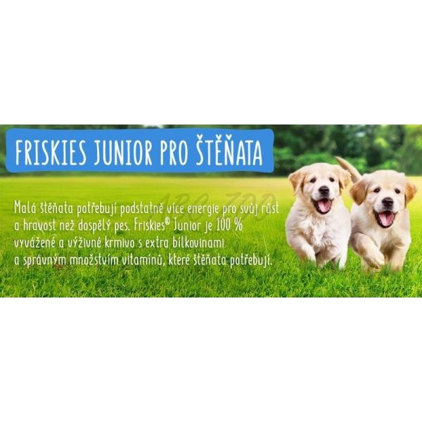 Mladé šteniatka potrebujú, kvôli svojmu rastu a hravosti, podstatne viac energie ako dospelé psy. Friskies® Junior je 100 % vyvážené a výživné krmivo s bielkovinami navyše a správnym množstvom vitamínov zodpovedajúcich potrebám šteniatok.
