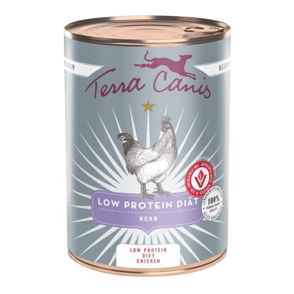 Konzervy Terra Canis z línie Low Protein predstavujú špeciálne vysoko stráviteľné krmivo so zníženým obsahom medi, fosforu a sodíka. Obsahuje nebielkovinové zdroje energie: repkový olej, zemiaky a kokosovú múku. Receptúra je doplnená o tekvicu a tri liečivé byliny: brezové listy, žihľavu a púpavu. Tieto bylinky sú známe svojim pozitívnym vplyvom na pečeň a obličky. Všetky zložky sú 100% ľudskej kvality.