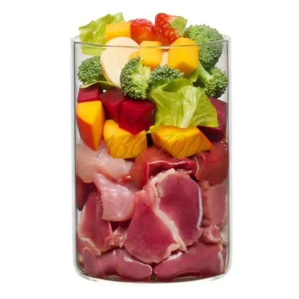 Zloženie: Kuracie srdce (24 %), kurací žalúdok (18 %), kuracia svalovina (9 %), kuracia pečeň (9 %), tekvica, cvikla* (6 %), brokolica, rímsky šalát, mango (4 %), jablko, petržlenová vňať, jahody, kokosová múka (1 %), repkový olej, sušený kokos, chia semienka* (0,4%), kvasnice*, škrupina ustrice*, žerucha*, levanduľa*, šalvia*, maca* (0,2%), ginkgo* (0,2%), šípky*, jačmenná tráva* (0,2%), minerálny íl, andská soľ, spirulina* (0,1%), minerály