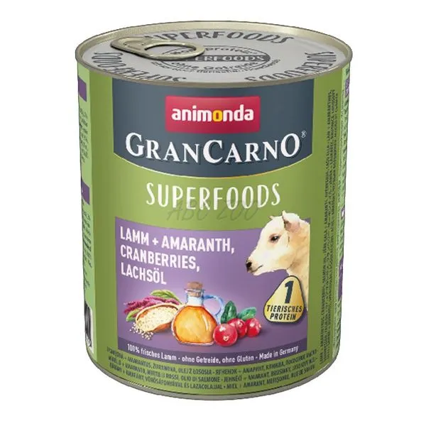 Animonda GranCarno Superfoods je vyvážená konzerva s jahňacím mäsom, amarantom, brusnicami a lososovým olejom pre dospelé psy (1-6 rokov) všetkých plemien.