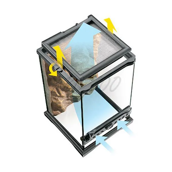 Otvárateľné dvierka na prednej strane umožňujú jednoduchý prístup pre čistenie a kŕmenie zvierat. Špeciálne dizajnovaná poistka zabraňuje úniku živočíchov. Vrchná vetracia mriežka prepustí UVB a infračervené lúče a dá sa celá odstrániť pre jednoduchší prístup v prípade upratovania alebo aranžovania dekorácie. Vzadu na vetracej mriežke sa nachádza 5 uzatvárateľných otvorov pre káble a hadičky. Dolné časti stien terária sú vyvýšené pre používanie niekoľkých vrstiev podstielky pre plazy. Pozadie je súčasťou balenia.
