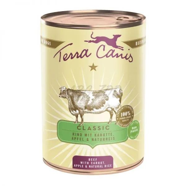 Konzervy Terra Canis z línie CLASSIC obsahujú vysoký podiel mäsa a čerstvej zeleniny, ovocia a byliniek. Na živiny bohaté, ľahké, bezlepkové pseudozrná (napr. proso, amarant, ryža natural) sú pridávané vo veľmi malých množstvách, ktoré sú pre psa ľahko stráviteľné (4 – 10 %). Prírodné prísady (morské riasy, minerálny íl, peľ kvetov, šípky, andská soľ, pivovarské kvasnice) dodávajú dôležité vitamíny, minerály a stopové prvky. Repkový olej poskytuje cenné esenciálne mastné kyseliny. Všetky zložky sú 100% ľudskej kvality.