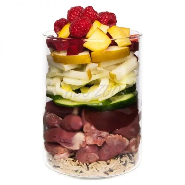 Zloženie: Kačacie mäso 43 % (kačacie srdce 37 %, kačacia pečeň 6 %), vývar 19 %, fenikel 6 %, hruška 6 %, broskyňa 6 %, uhorka 6 %, cvikla 6 %*, prírodná ryža 6 %, malina 1 %, minerály 1 %*, repkový olej, bazalka*, rasca*, majorán*, tymian*, andská soľ, sezamové semienka 0,3 %*, pivovarské kvasnice*, ustricová lastúra*, minerálny íl*, spirulina*
