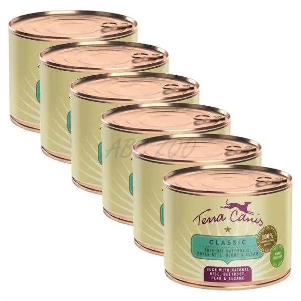 Konzervy Terra Canis z línie CLASSIC obsahujú vysoký podiel mäsa a čerstvej zeleniny, ovocia a byliniek. Na živiny bohaté, ľahké, bezlepkové pseudozrná (napr. proso, amarant, ryža natural) sú pridávané vo veľmi malých množstvách, ktoré sú pre psa ľahko stráviteľné (4 – 10 %). Prírodné prísady (morské riasy, minerálny íl, peľ kvetov, šípky, andská soľ, pivovarské kvasnice) dodávajú dôležité vitamíny, minerály a stopové prvky. Repkový olej poskytuje cenné esenciálne mastné kyseliny. Všetky zložky sú 100% ľudskej kvality.