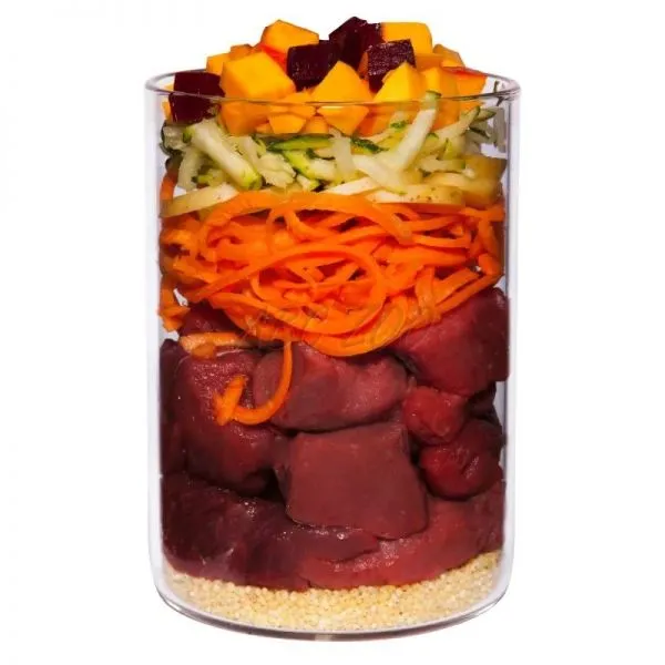 Zloženie: Divina 37 %, vývar 19 %, zemiaky 8 %, mrkva 7 %, cuketa 6 %, tekvica 6 %, zeler 4 %, biely jogurt 3 %, červená repa 3 % *, amarant 3 %, minerály 1 % *, repkový olej, pivovarské kvasnice *, brusnice 0,3 % *, bazalka *, minerálny íl *, ustricová lastúra *, spirulina *