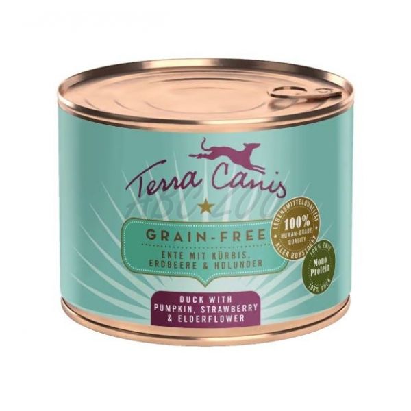 Konzervy Terra Canis z línie Grain-Free obsahujú vysoký podiel mäsa a čerstvej zeleniny, ovocia a byliniek. Prírodné prísady (morské riasy, minerálny íl, peľ kvetov, šípky, andská soľ, pivovarské kvasnice) dodávajú dôležité vitamíny, minerály a stopové prvky. Repkový olej poskytuje cenné esenciálne mastné kyseliny. Všetky zložky sú 100% ľudskej kvality. Toto bezobilné krmivo je vhodné najmä pre psov s intoleranciou na obilniny, ako aj pre psov, ktorí potrebujú zo zdravotných dôvodov kŕmivo bez obilnín.