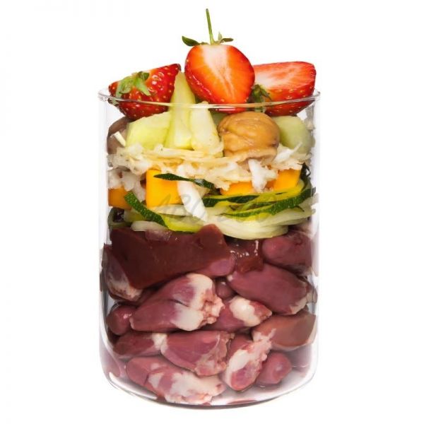 Zloženie: Kačacie mäso 46 % (kačacie srdce 43 %, kačacia pečeň 3 %), vývar 18 %, tekvica 10 %, mrkva 8 %, cuketa 4 %, zeler 4 %, jablko 3 %, melón 3 %, sladký gaštan, jahoda 1 %, minerály 1 %*, repkový olej, pivovarské kvasnice*, baza 0,2 %*, psyllium*, lastúra ustrice*, trebuľka*, púpava*, bazalka*, minerálny íl*, petržlenová vňať*, andská soľ, spirulina*