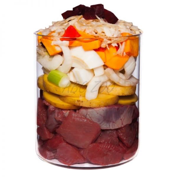 Zloženie: Konská svalovina (59 %), zemiaky, tekvica (7 %), kvaka (7 %), fenikel (4 %), paštrnák*, červená repa*, kokosová múčka, repkový olej, ustrice*, pivovarské kvasnice*, šalvia* (0,2%), púpava*, bazový kvet*, arónia*, andská soľ, minerálny íl*, morské riasy*, minerály