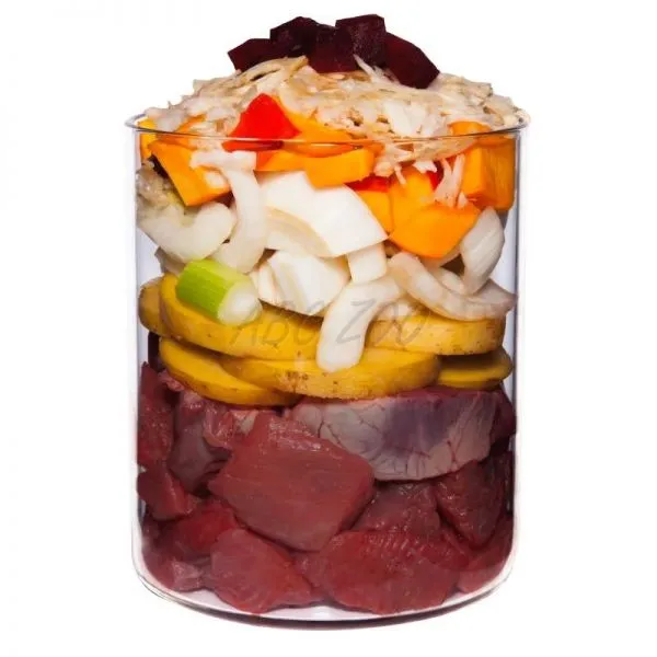 Zloženie: Konské mäso 46 %, vývar 23 %, zemiaky 9 %, tekvica 6 %, kvaka 6 %, fenikel 3 %, cvikla 3 %*, minerály 1 %*, repkový olej, kokosová múka, paštrnák*, pivovarské kvasnice*, šalvia 0,1 %*, púpava*, baza lekárska*, ustricová lastúra*, andská soľ, minerálny íl*, spirulina*