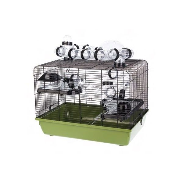 Klietka obsahuje : 2x poschodie, 2x rebrík, misku, tunel, domček, kolotoč