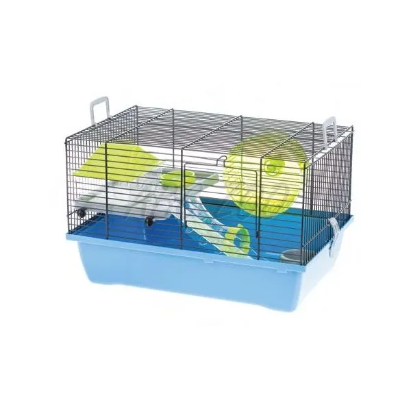 Klietka pre škrečka s tunelom, kolotočom, miskou, domčekom a poschodím. Zelená farba výbavy, modrá vanička.   Viac detailov