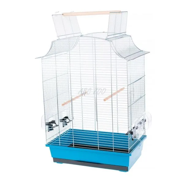 Klietka pre stredné papagáje GRETA CABRIO. Chromovaná mriežka. Modrá farba vaničky. Viac detailov