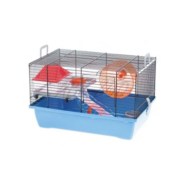 Klietka pre škrečka s tunelom, kolotočom, miskou, domčekom a poschodím. Oranžová farba výbavy, modrá vanička.  Viac detailov