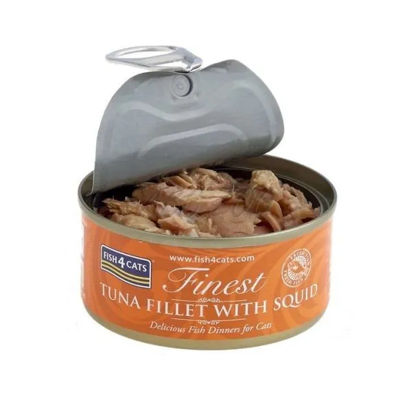Fish4Cats Finest Tuna Fillet with Squid je konzerva pre mačky s tuniakom a kalmárom, vyrobená z kvalitných rýb a zeleniny.